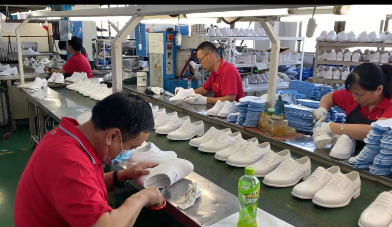 每一雙看似簡潔大方的鞋品里,都飽含金猴集團賦予其中的十足“科技感”:采用納米防靜電技術,有效杜絕灰塵污染,讓每一雙白皮鞋保持潔白如云的狀態;采用橡筋布假系帶結構,在正常系帶款式部位巧妙使用穿皮條皮工藝;鞋墊底采用具備抑菌除臭吸汗的納米寶麗優材質,同時在鞋底加入呼吸換氣裝置,讓參會人員時刻保持足部干爽清涼。