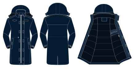 整體顏色為藏青色??钍綖橹虚L大衣款式。具有阻燃、防靜電、防水、防風等功能。