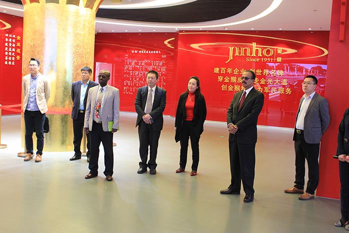 伯哈內大使一行認真參觀了生產車間制鞋流水線,詳細了解了內銷、出口及軍用皮鞋研發生產情況,高度贊揚金猴皮鞋成功包攬中國馳名商標、中國名牌產品、中國真皮領先鞋王、中國500最具價值品牌等所有行業頂級殊榮,暢銷全國并出口40多個國家和地區,曾多次被全國部分?。ㄊ校┤舜?、政協、工會、團委、公安、檢察院、法院、司法、工商、質檢、海關等單位選定為工作用鞋。在膠東(威海)黨性教育基地金猴展陳館,伯哈內大使認真參觀了企業文史館和私人定制館,對公司做好黨性教育基地與工業旅游示范點相結合的大文章頻頻點贊。