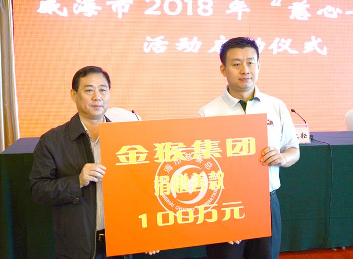 9月19日,威海市2018年“慈心一日捐”活動啟動儀式在東山賓館舉行。集團公司董事、副總經理岳國威代表全市愛心企業和個人宣讀了《2018年“慈心一日捐”活動倡議書》,并代表金猴集團向市慈善總會捐款100萬元。